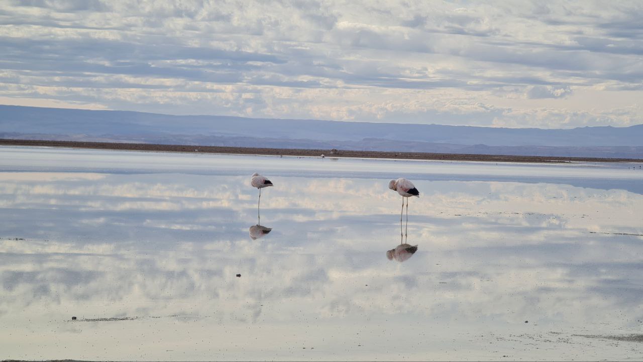Flamingos feed in slow, elegant circles, their reflections trembling in the thin air.